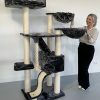 Met een grote dikke bodemplaat en onderin een gecurvde trap bekleed met sisalkleed om aan te krabben. Het verstophuis (53x38x31cm) heeft een grote ingang en via de bovenkant kan uw kat via een half ronde pijp naar de volgende verdieping komen. Ook eventueel eenvoudig via de opstap aan de linkerzijde. Ook hangt er een leuk 5cm dik speeltouw aan de krabpaal. Op de 2e verdieping is tevens een grote ligplek. Geheel bovenin zijn nog eens 3 grote ligplekken. Waarvan een grote directiezetel van 60×43 cm met 5 cm dik kussen en 2 x hangmat de Luxe ( Draaibaar) met wel 45 cm diameter ligplek.
