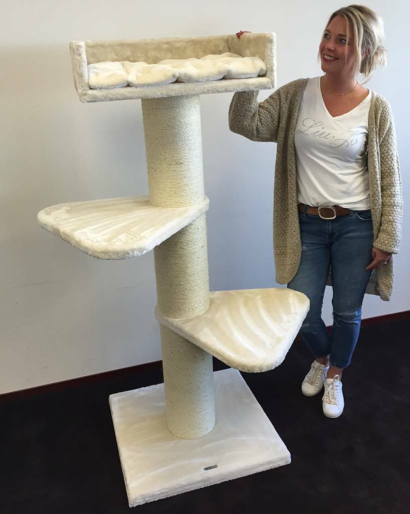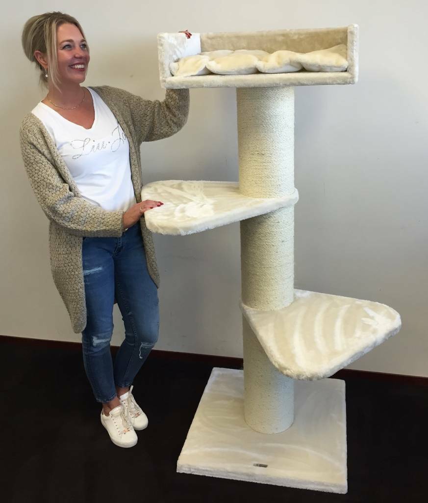 Krabpaal Royalty Creme is een zeer stevige krabpaal met zijn 20cm diameter dikke sisalpalen en verzwaarde bodemplaat van 60×60 en 4,5cm dik. Krabpaal Royalty is een krabpaal voor zware katten als Ragdoll of Maine coon of voor de klant die echt een stevige krabpaal wenst. De krabpaal Royalty heeft 2 grote (55×55) draaibare plateau’s en daarboven een enorme directiezetel van 60×43 cm met een 15cm hoge opstaande rand. Hierop ligt een 5 cm dik en heerlijk zacht kussen, welke uitneembaar is. Door zijn hoogte van 155 cm een ideale krabpaal voor in uw woonkamer en een ideale uitkijk en relaxplek voor uw kat.