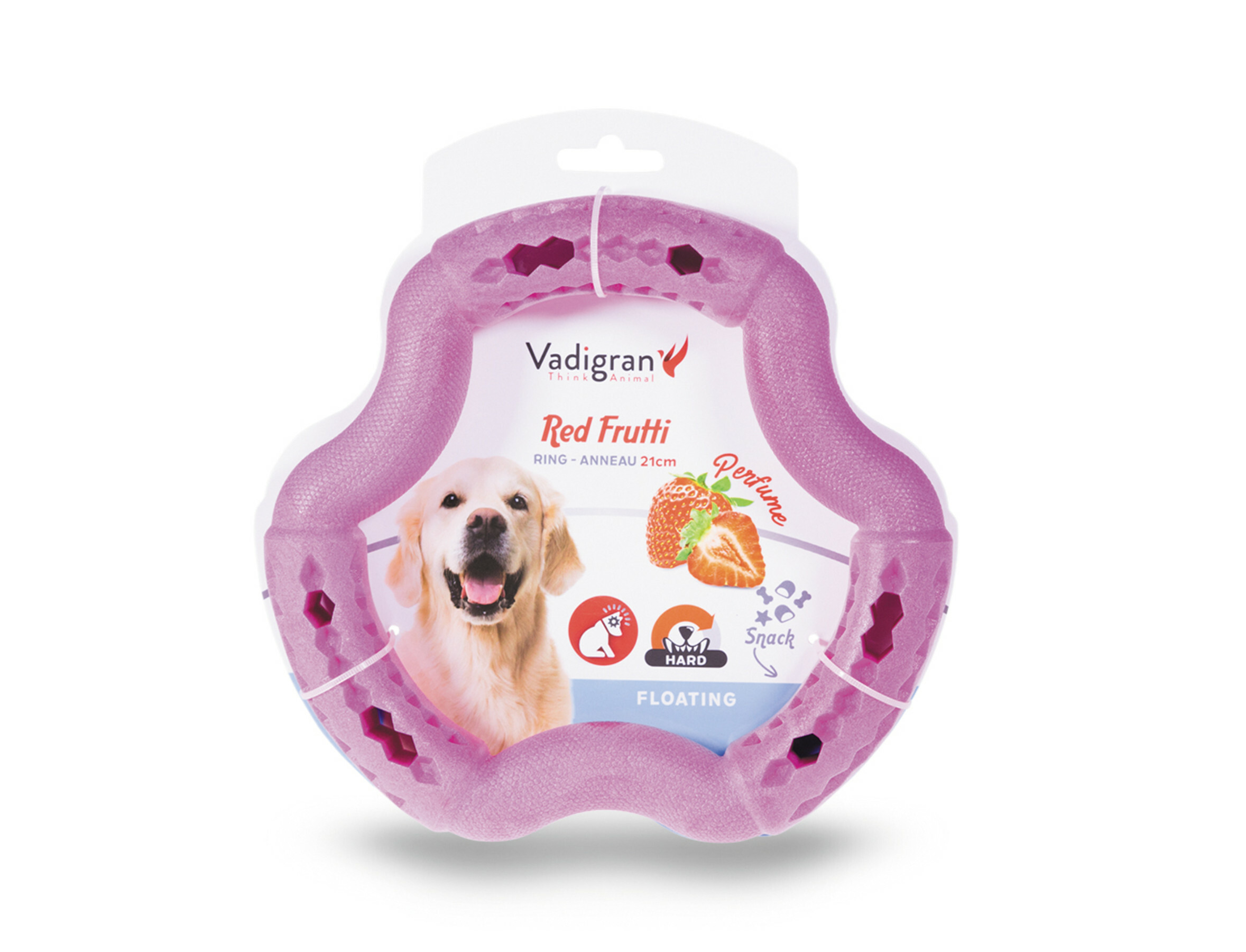 Thermoplastisch Rubber. Sterk en Duurzaam. Dit speeltje is niet enkel stevig, maar ook zeer aantrekkelijk voor de hond dankzij zijn heerlijke aardbeiengeur.